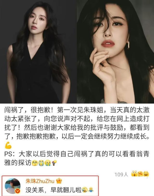 但是最让人意外的是后续,翁青雅道歉时自嘲“闯祸了可以看我的探访”,朱珠直接回复“没关系,早就翻儿啦”,这波高情商真的赢麻了! 朱珠说的是“早就翻儿了”没有篇字,一语双关(正常应该是翻篇儿啦,翻儿有两重意思,一层表示采访确实不好,翻了,意思是说翁清雅翻车,另一层也有缓和的猜想余地,意思这事翻篇儿了)